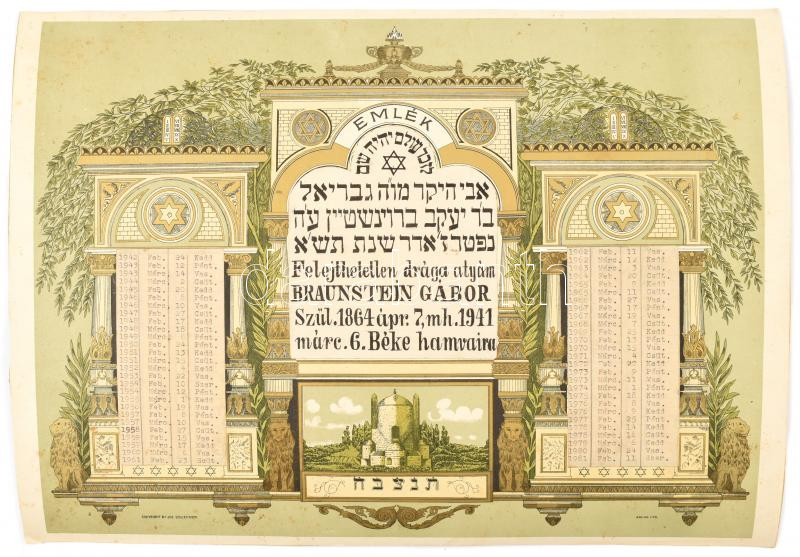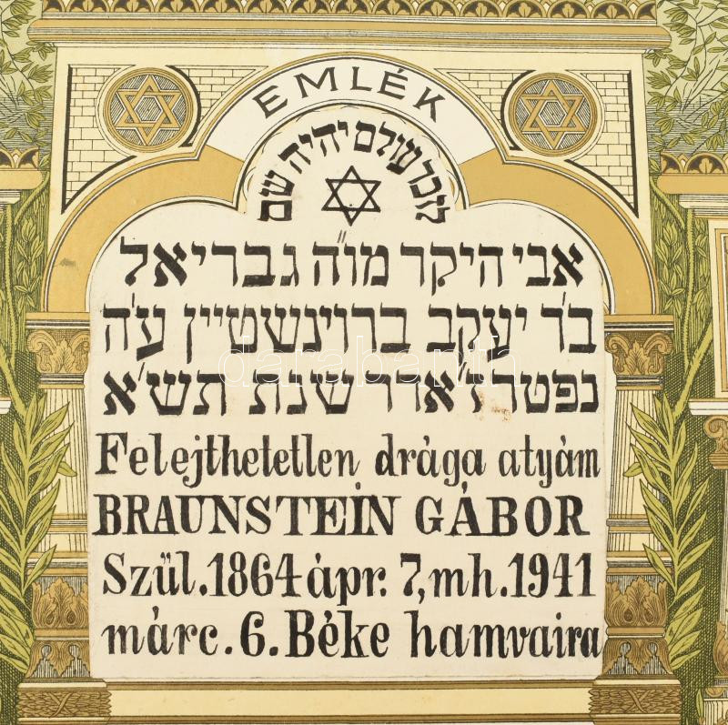 1941 Judaika halotti emlék tábla litografált grafikával. / Judaica lit... https://www.darabanth.com/de/454-Fernauktion/454.0/Kunst-Dokumente-andere-Sammelgebiete/Judaica~1500004/1941-Judaika-halotti-emlek-tabla-litografalt-grafikaval-Judaica-litho-tables-42x30-cm~II3014386