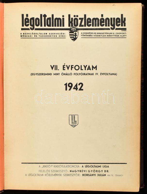 1942 Légoltalmi Közlemények, VII. évf. (mint önálló folyóirat IV. évf.), szerk.: Borsányi Julián, komplett évf., aranyozott gerincű félvászon kötésben, sérült gerinccel, megerősített kötéssel, máskülönben jó állapotban