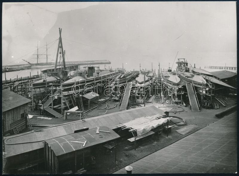 cca 1907 A Ganz Danubius fiumei telephelyén Huszár osztályú romboló hadihajókat építenek. A Huszár osztályú rombolókat 1880-as évek végén kezdték el tervezni angol minta alapján az Osztrák-Magyar flottának, de mire elkészültek a módosításoknak és az időknek köszönhetően teljesen elavulttá váltak. Modern nagyítású fotó. 18x13 cm /