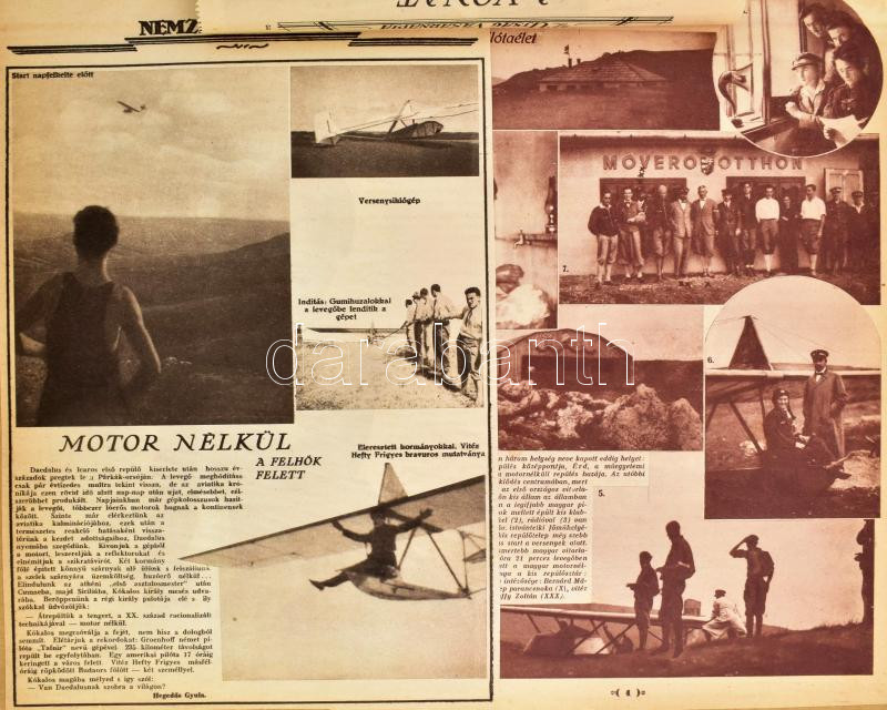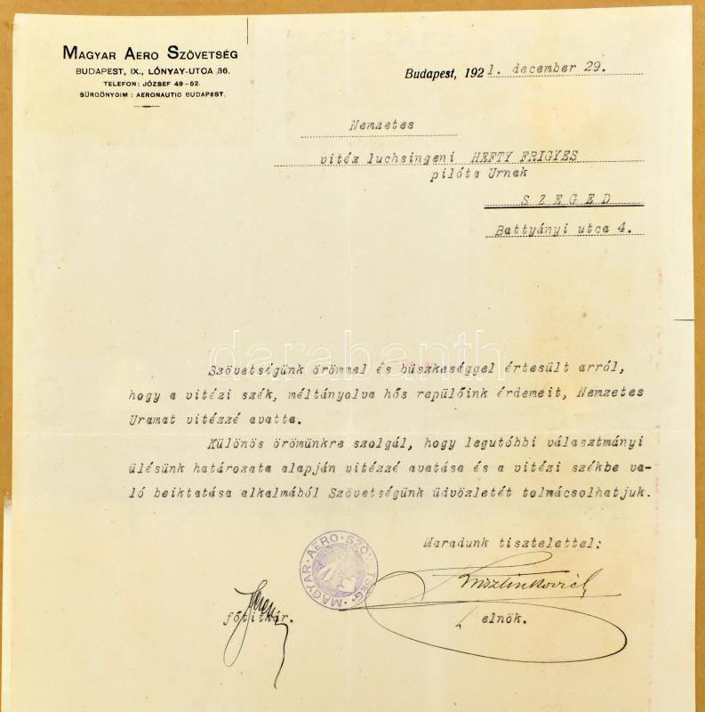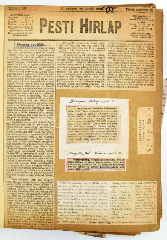 cca 1912-60 Hefty Frigyes (1894-1965) I. világháborús katonai repülő pilóta sajtó albuma, saját kezű gyűjtése, autográf feliratával és névbejegyzésével a borítón, aviatikai tevékenységét tárgyaló cikkek és fotók, szemlék, idézetek; saját aviatikai tárgyú cikkei, szakközleményei, novellák stb.; sajtó regiszter, függelék. Kb. 42 oldalon, albumlapokra beragasztott és ezen felül további lazán mellékelt cikkek, néhány az I.- világháború idejéből, többségében a Horthy-korszakból és néhány kevés az emigráció éveiből. XX. sz eleji, egészvászon kötésű, gerincén sérült albumban. Becses gyűjtői ritkaság!!!