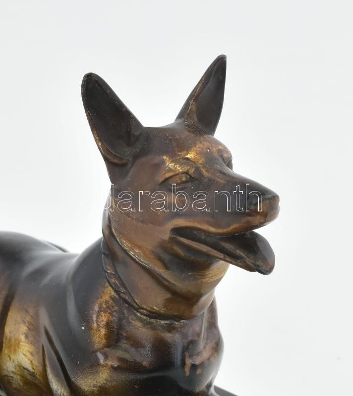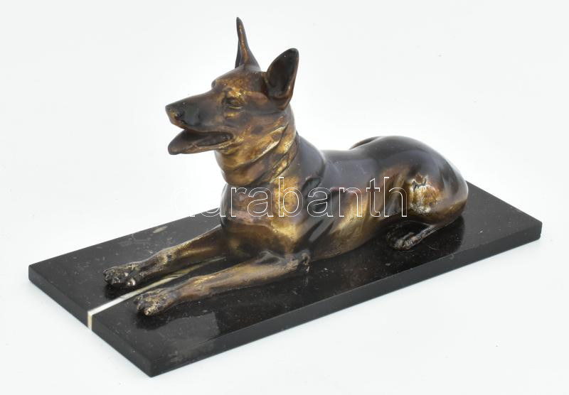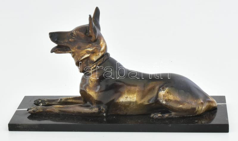 Szépen kidolgozott, bronzírozott fém kutya szobor, vékony márvány talpon. h: 18x11 cm