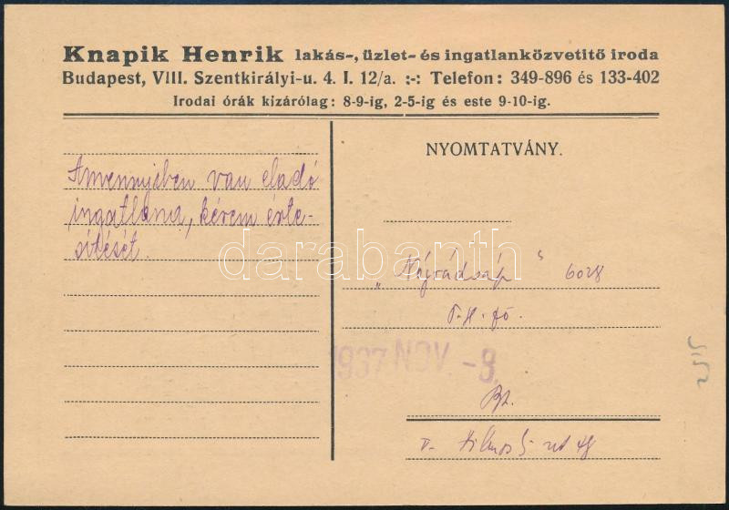 Beschreibung: 1937 Knapik Henrik lakás-, üzlet- és ingatlanközvetítő fejléces reklámnyomtatványa