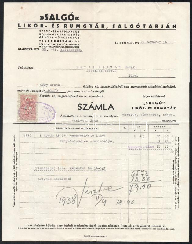 1937 ,,Salgó" Likőr és Rumgyár, Salgótarján fejléces számla https://www.darabanth.com/de/454-Fernauktion/454.0/Kunst-Dokumente-andere-Sammelgebiete/Werbungen~2000024/1937-Salgo-Likor-es-Rumgyar-Salgotarjan-fejleces-szamla~II3030300
