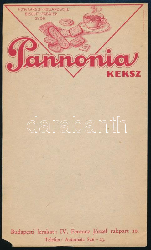 Pannonia keksz számolócédula, bal alsó sarkában kissé sérült https://www.darabanth.com/de/454-Fernauktion/454.0/Kunst-Dokumente-andere-Sammelgebiete/Werbungen~2000024/Pannonia-keksz-szamolocedula-bal-also-sarkaban-kisse-serult~II3027553