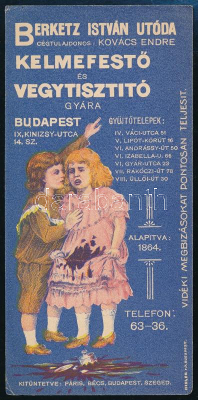 cca 1910-1920 Berketz István utóda kelmefestő és vegytisztító gyára (B... https://www.darabanth.com/de/454-Fernauktion/454.0/Kunst-Dokumente-andere-Sammelgebiete/Werbungen~2000024/cca-1910-1920-Berketz-Istvan-utoda-kelmefesto-es-vegytisztito-gyara-Bp-IX-Kinizsy-utca-14~II3029398