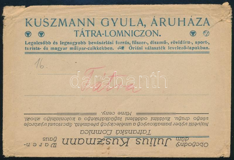 cca 1910 Tátralomnic, Kuszmann Gyula áruháza reklámos levelezőlap https://www.darabanth.com/de/454-Fernauktion/454.0/Kunst-Dokumente-andere-Sammelgebiete/Werbungen~2000024/cca-1910-Tatralomnic-Kuszmann-Gyula-aruhaza-reklamos-levelezolap~II3024465