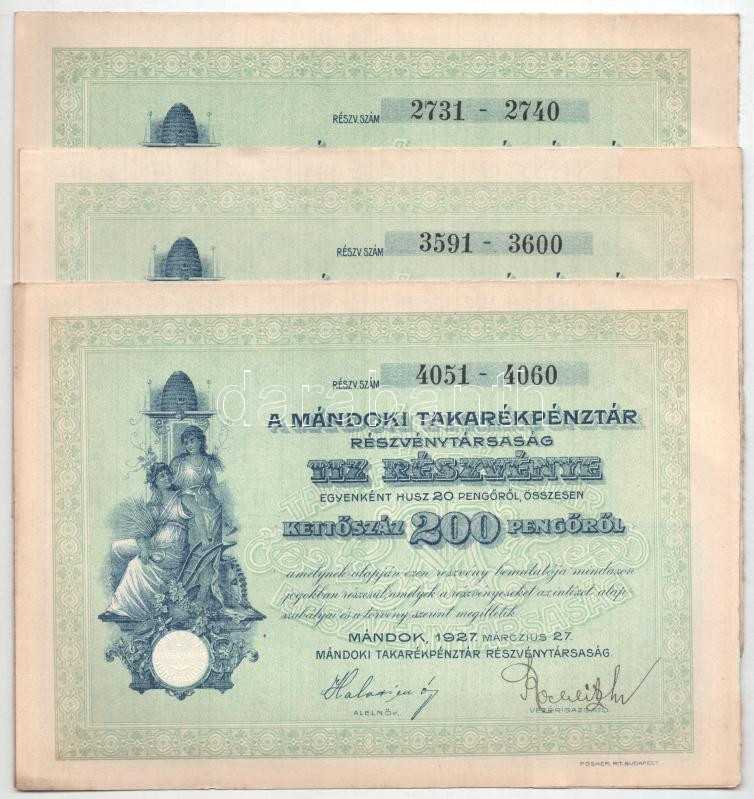 Beschreibung: Mándok 1927. "Mándoki Takarékpénztár Részvénytársaság" tíz részvénye egyenként 20P-ről, összesen 200P-ről (3x) T:AU