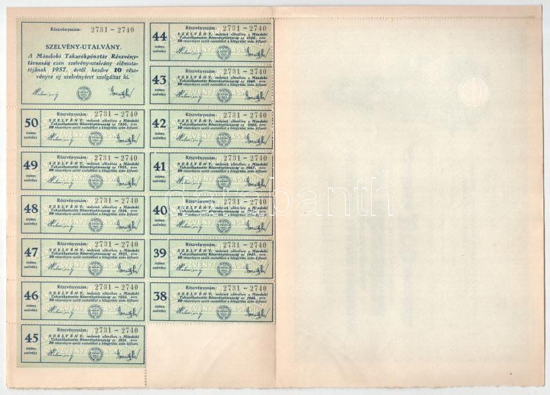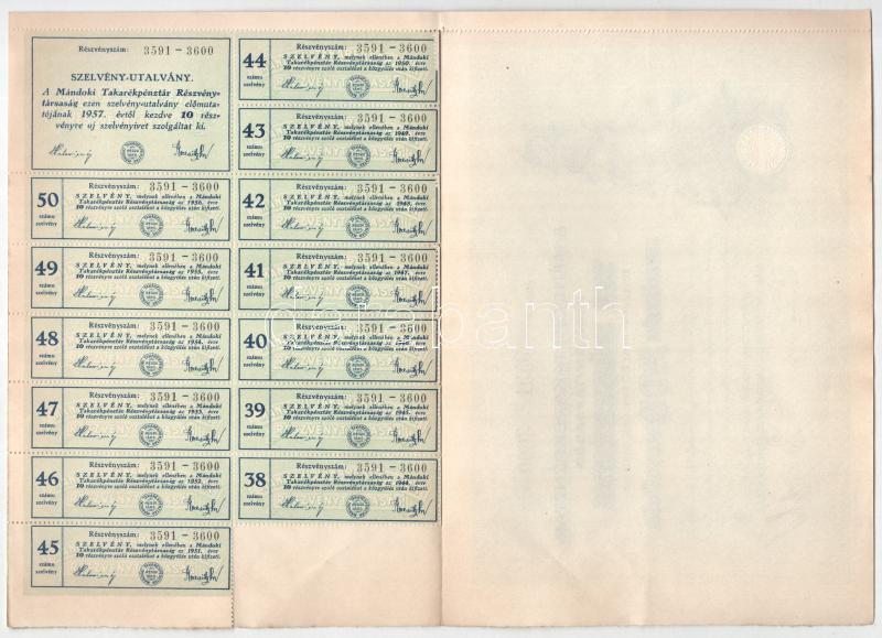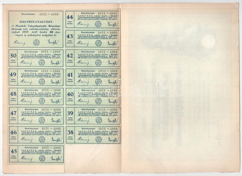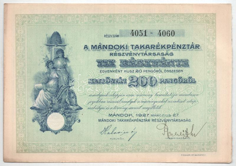 Mándok 1927. "Mándoki Takarékpénztár Részvénytársaság" tíz r... https://www.darabanth.com/de/454-Fernauktion/454.0/Numismatik/Aktien-und-Tickets~2000005/Mandok-1927-Mandoki-Takarekpenztar-Reszvenytarsasag-tiz-reszvenye-egyenkent-20P-rol~II2971930