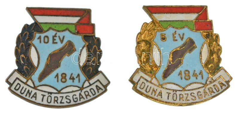 ~1960-1970. "Duna (Cipőrgyár) Törzsgárda" zománcozott bronz törzsgárda jelvény 5 év után (22x23mm) + "Duna (Cipőrgyár) Törzsgárda" zománcozott bronz törzsgárda jelvény 10 év után (22x23mm) T:AU