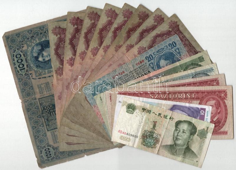 Beschreibung: 16db-os, nagyrészt magyar bankjegytétel, benne 1902. 1000K + 1913. 20K + 1930. 100P (8db) + 1962-1980. 10Ft-100Ft (4xklf) + Kína 1999. 1Y + Németország 1991. 10M T:F-G