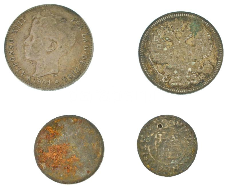 Amerikai Egyesült Államok ~1910. 10c Ag "Mercur" korrózió + Orosz Birodalom 1909. 20k Ag + Spanyolország 1901. 1P Ag "XIII. Alfonz" + Magyarország 15?? Denár Ag (0,57g) korrózió T:F-G