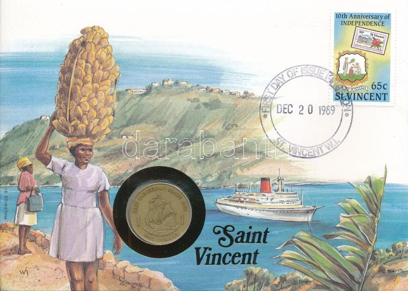 Kelet-Karibi Államok / Saint Vincent 1981. 1$ Al-bronz felbélyegzett borítékban, bélyegzéssel, német nyelvű leírással T:VF Eastern Caribbean States / St. Vincent 1981. 1 Dollar Al-bronze in envelope with stamp and cancellation, with German description C:VF