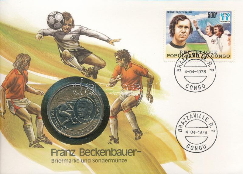 Niue 1988. 5D Cu-Ni "VIII. Európai Futball Bajnokság - Németország / Franz Beckenbauer" forgalomba nem került emlékkiadás felbélyegzett borítékban, alkalmi bélyegzéssel, német nyelvű leírással T:UNC Niue 1988. 5 Dollars Cu-Ni "8th European Football Championship - Germany / Franz Beckenbauer" non-circulating commemorative coin in envelope with stamp, cancellation, and a description in german C:UNC Krause KM#12