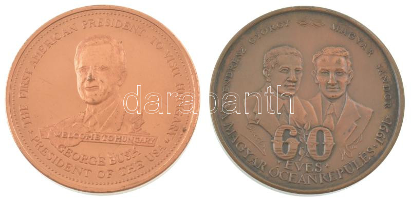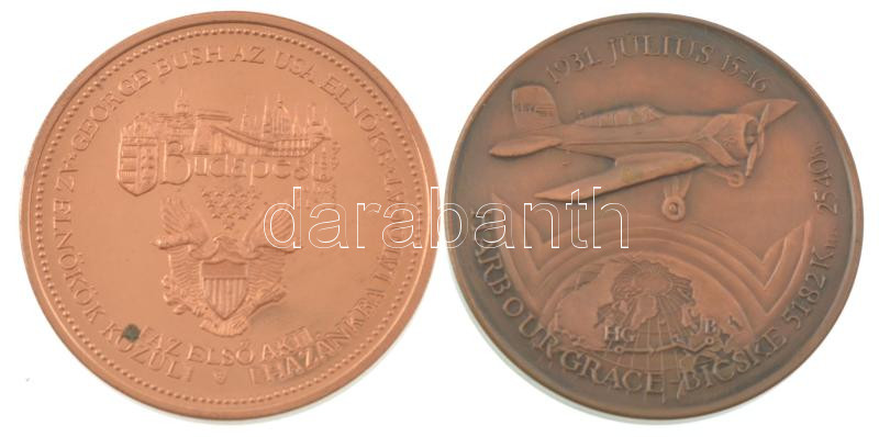 Bozó Gyula (1913-2004) 1989. "George Bush látogatása Magyarországon" kétoldalas bronz emlékérem (42,5mm) + 1991. "60 éves a magyar óceánrepülés Endresz György - Magyar Sándor / Harbour Grace - Bicske" kétoldalas bronz emlékérem (42,5mm) T:AU
