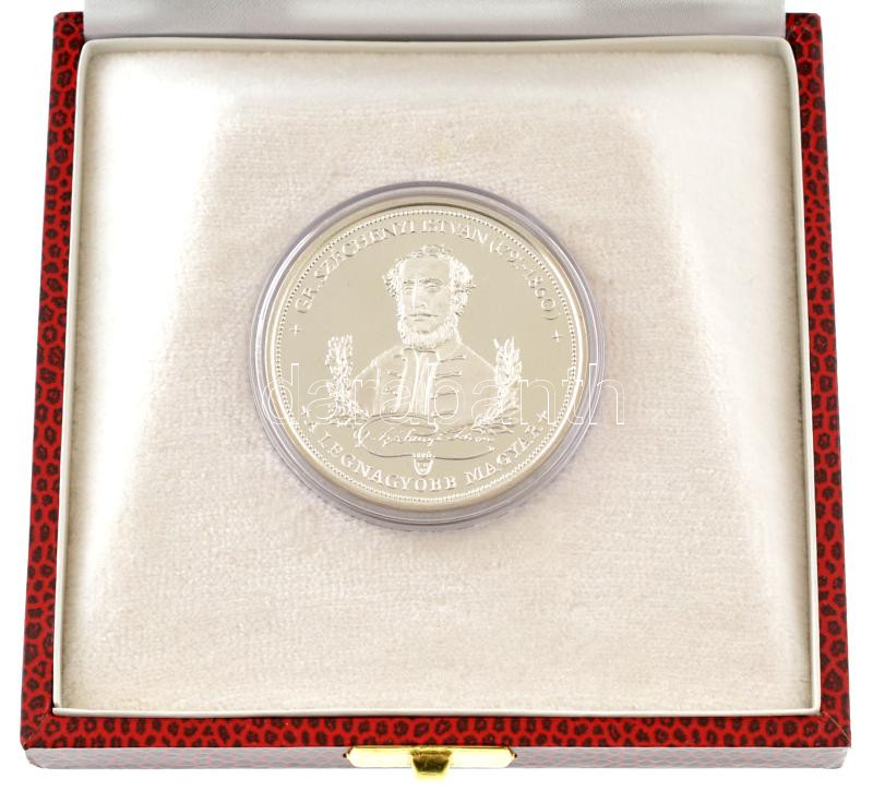 Bozó Gyula (1913-2004) ~1990. "Gr. Széchenyi István (1791-1860) A Legnagyobb Magyar / A Nemzetgazdasági Minisztertől" peremen jelzett Ag emlékérem eredeti dísztokban (34,22g/0.925/42,5mm) T:PP kis fo.