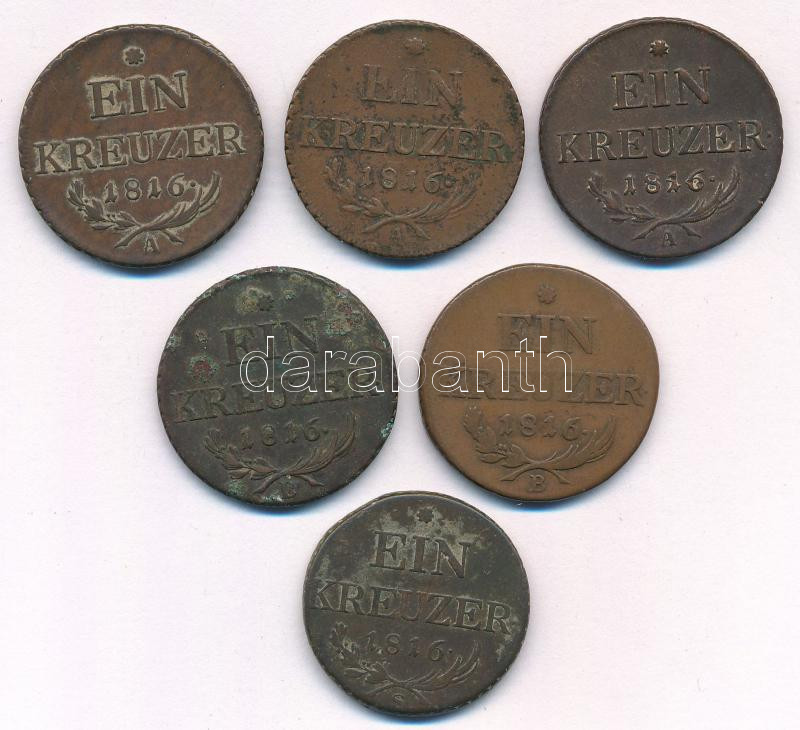 1816. 1kr Cu (6db, ebből 3db A-verdejellel, 2db B-verdejellel, 1db S-v... https://www.darabanth.com/de/454-Fernauktion/454.0/Numismatik/Ungarische-Munzen-und-Munzen-mit-ungarischem-Munzzeichen~2000008/1816-1kr-Cu-6db-ebbol-3db-A-verdejellel-2db-B-verdejellel-1db-S-verdejellel-TVF-F~II3024355