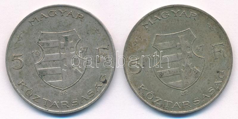 1947. 5Ft Ag "Kossuth" (2x) T:VF,F patina, kis ph. Adamo F8.... https://www.darabanth.com/de/454-Fernauktion/454.0/Numismatik/Ungarische-Munzen-und-Munzen-mit-ungarischem-Munzzeichen~2000008/1947-5Ft-Ag-Kossuth-2x-TVF-F-patina-kis-ph-Adamo-F81~II3008725