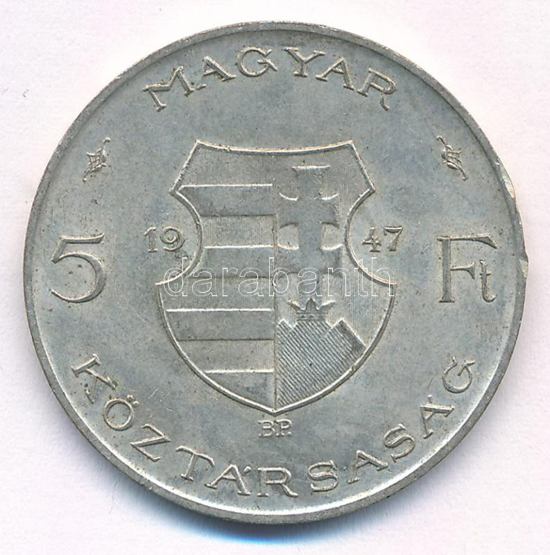 1947. 5Ft Ag "Kossuth" T:AU patina Adamo F8.1 https://www.darabanth.com/de/454-Fernauktion/454.0/Numismatik/Ungarische-Munzen-und-Munzen-mit-ungarischem-Munzzeichen~2000008/1947-5Ft-Ag-Kossuth-TAU-patina-Adamo-F81~II3013824