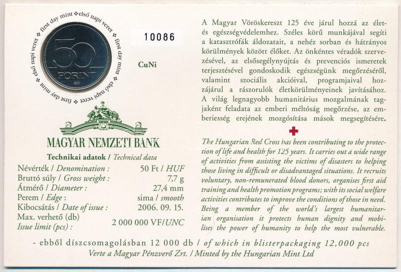 Beschreibung: 2006. 50Ft Cu-Ni "125 éves a Magyar Vöröskereszt" első napi veret sorszámozott emléklapon "10086" T:UNC