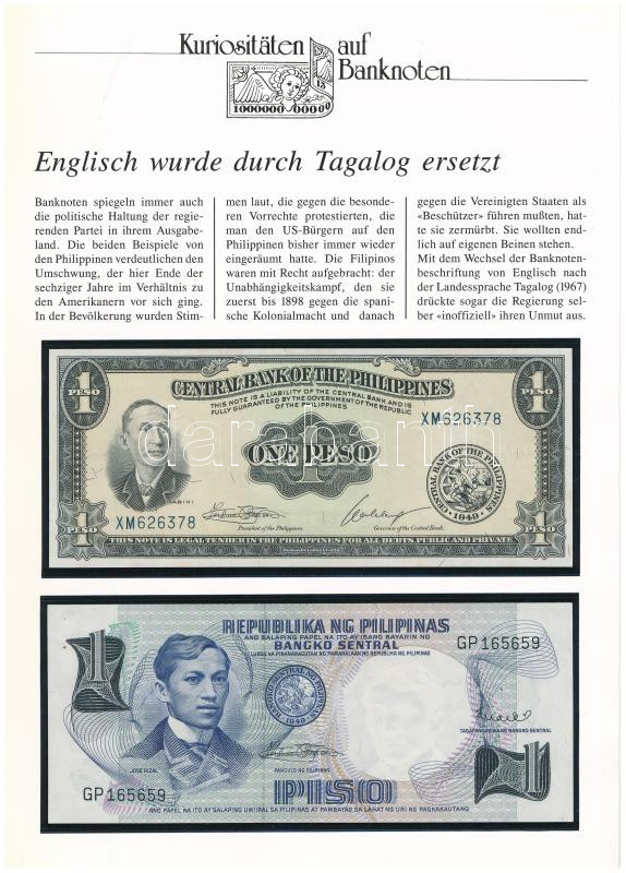 Fülöp-szigetek 1951-1970. 1P + 1969. 1P német nyelvű "Kuriositäten auf Banknoten" tájékoztatólappal T:UNC,AU az egyiken tűzőgéply.