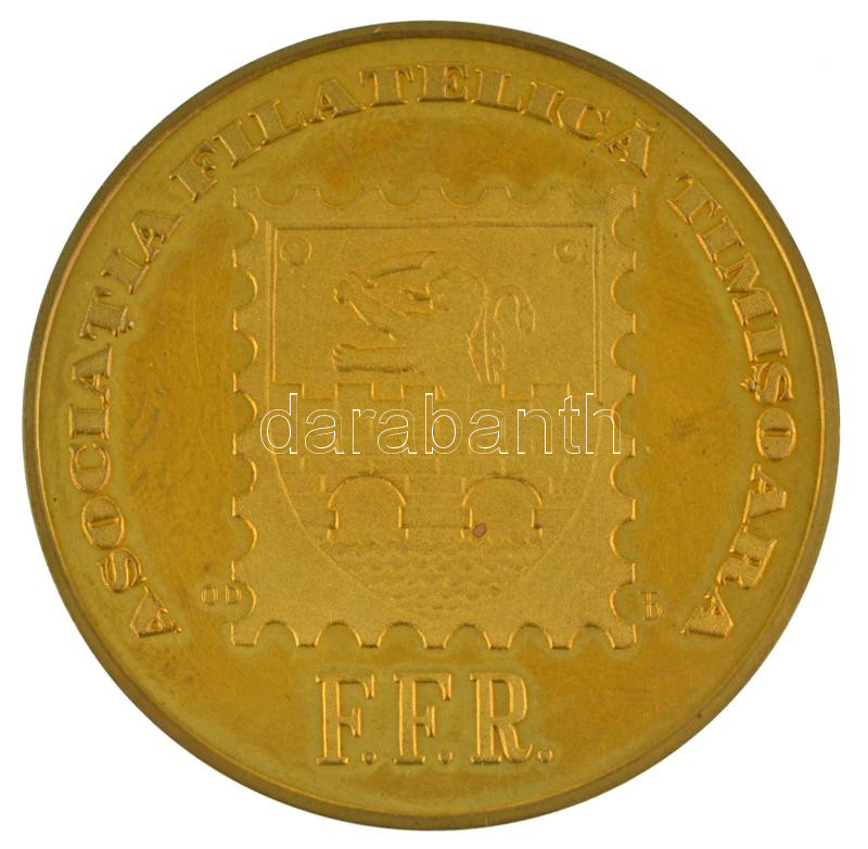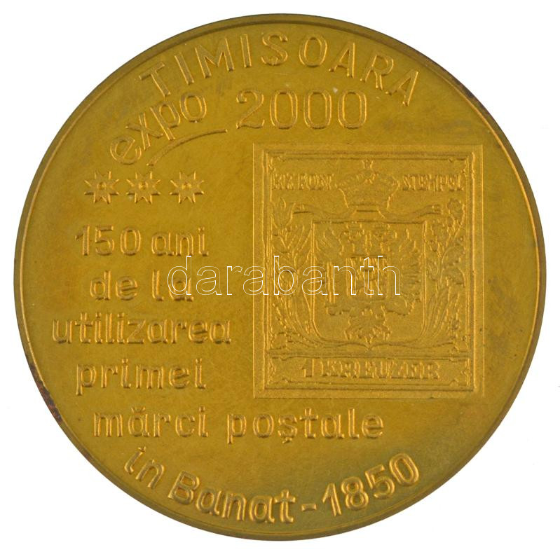 Románia 2000. "Temesvári Kiállítás 2000 - Az első postabélyeg 150 éves évfordulójára / Temesvári Bélyeggyűjtő Egyesület" kétoldalas, román nyelvű aranyozott fém emlékérem (48mm) T:AU (eredetileg PP) Romania 2000. "Timisoara expo 2000 - 150 ani de la utilizarea primei marci postale / Asociatia Filatelica Timisoara" gold plated commemorative medallion (48mm) C:AU (originally PP)