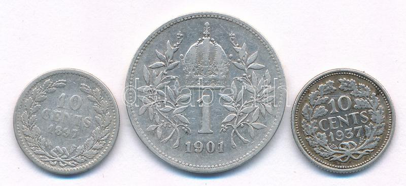 3db-os Ag érmetétel, közte Ausztria 1901. 1K Ag "Ferenc József" + Hollandia 1897. 10c Ag "I. Vilma" + 1937. 10c Ag "I. Vilma" T:XF-F