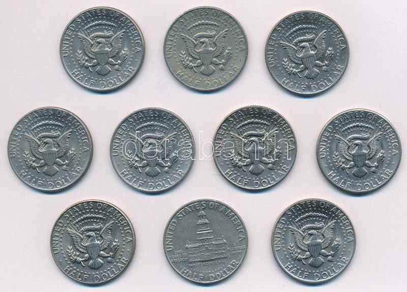 Amerikai Egyesült Államok 1971D-1985P 1/2$ Cu-Ni "Kennedy" (10xklf évszám és/vagy verdejel) közte 1976. 1/2$ Cu-Ni "A függetlenség 200. évfordulója (Bicentenárium)" T:AU-VF karc USA 1971D-1985P 1/2 Dollar Cu-Ni "Kennedy" (10xdiff year of mintage and/or mintmark) with 1976. 1/2 Dollar Cu-Ni "Bicentennial" commemorative coin in it C:AU-VF scratch
