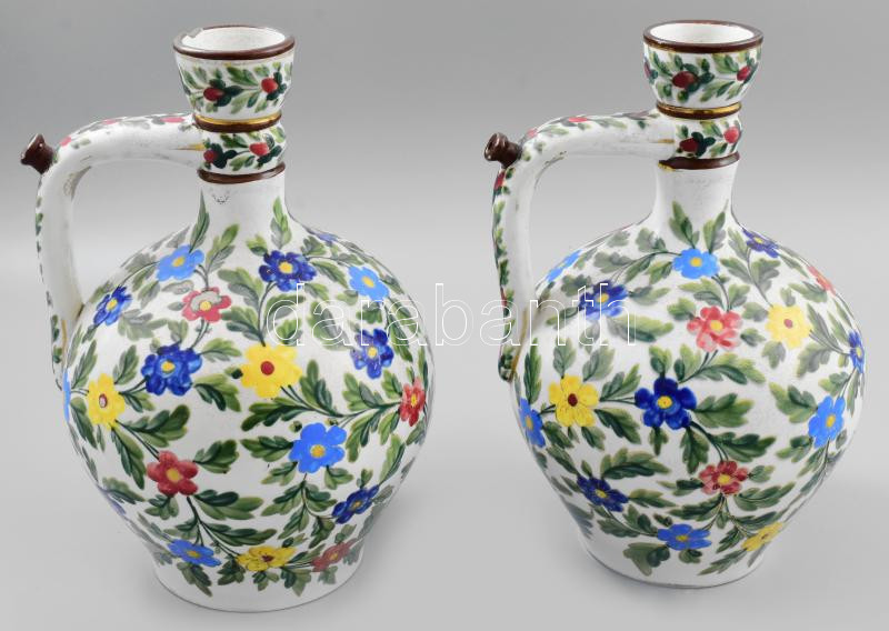 Beschreibung: 2 db antik fajansz csörgő korsó. Kézzel festett, jelzés nélkül, XIX. sz. kis kopásokkal 27 cm