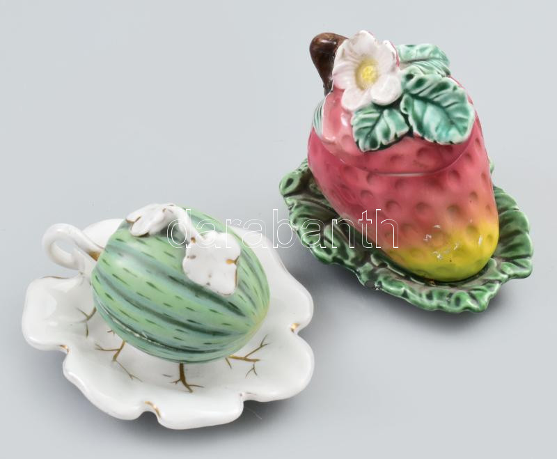Beschreibung: Antik 2 darab gyümölcsmintás fűszerkínáló. Kopással, egyik restaurált, m: 9-11 cm