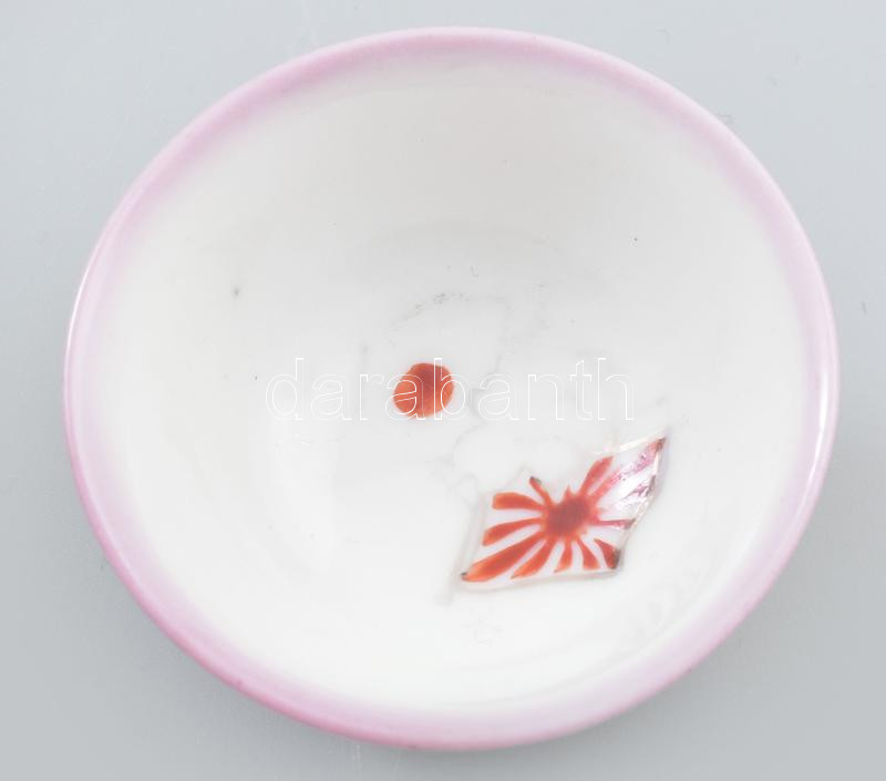 cca 1940-1944, Japán, Katonai szakés csésze. Fősereg. Öblében japán zászlók, pereménél cseresznyevirág színű festéssel. Kobayashi tulajdonosi megjelöléssel. Kopott, d: 5,5-6 cm, m: 3 cm