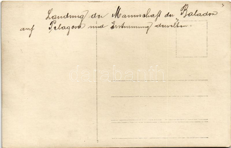 1915 Pelagosa, Palagruza; K.u.K. partraszállási akció Pelagosa szigeté... https://www.darabanth.com/de/455-Fernauktion/455.0/Ansichtskarten/Kriegsschiffe~1500027/1915-Pelagosa-Palagruza-KuK-partraszallasi-akcio-Pelagosa-szigetenel-SMS-Balaton-rombolo-~II3025446
