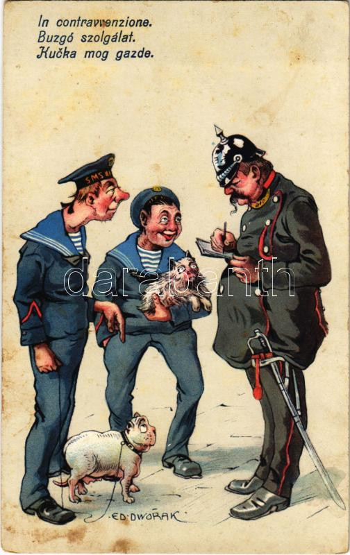 Beschreibung: Buzgó szolgálat / In contravvenzione / K.u.K. Kriegsmarine Matrosen / Austro-Hungarian Navy mariner humor. C. Fano Pola 25. 1914/15. s: Ed. Dworak (fl)