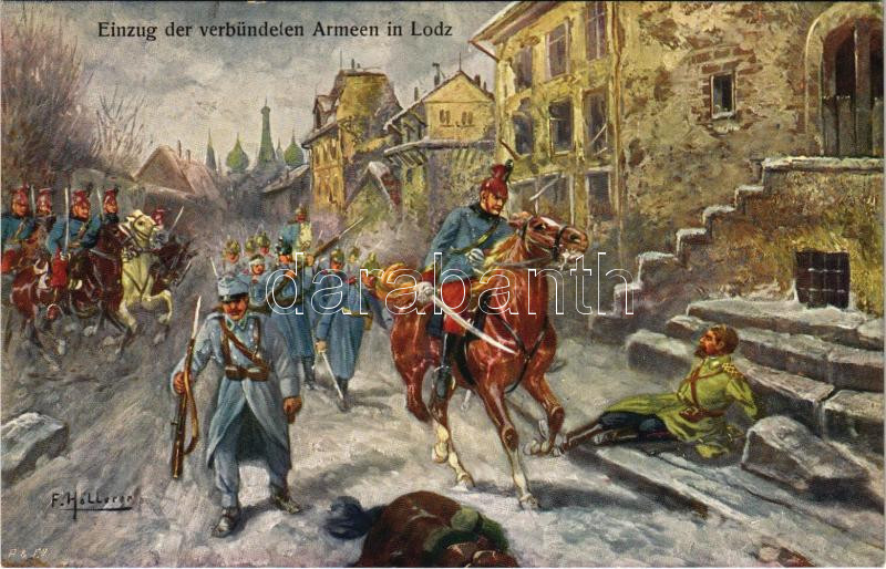 A szövetséges hadtest bevonulása Lódz-ba / Einzug der verbündeten Armeen in Lodz / WWI German and Austro-Hungarian K.u.K. military art postcard s: F. Höllerer (fl)