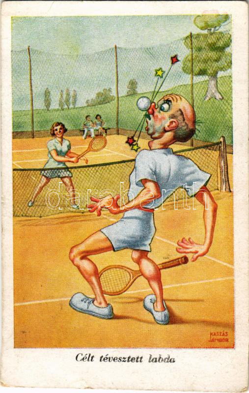 Célt tévesztett labda, tenisz humor / Tennis humour art postcard s: Ka... https://www.darabanth.com/de/455-Fernauktion/455.0/Ansichtskarten/Sport~1500045/Celt-tevesztett-labda-tenisz-humor-Tennis-humour-art-postcard-s-Kaszas-Jambor-kis-szakadas-~II3037567