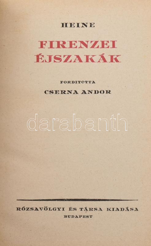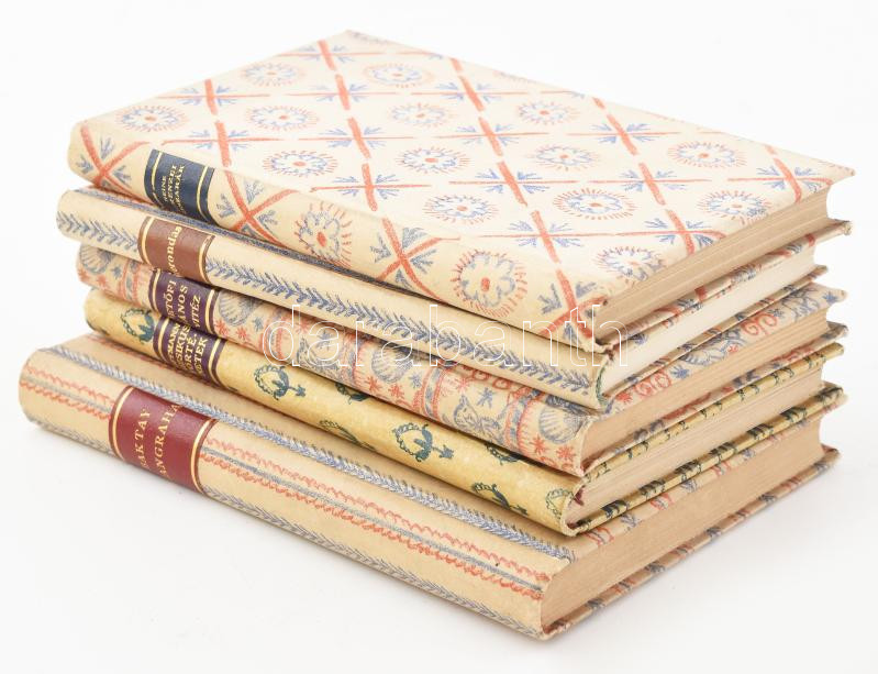 5 db könyv: Baktay Ervin: Szangraha. Indiai elbeszélések gyűjteménye. Bp., 1921, Székasi Sacelláry Pál. + Kis Helikon sorozat 4 kötete: Heine: Firenzei éjszakák; Herondas mimiambusai; Petőfi Sándor: János vitéz; E. T. A. Hoffmann: Muzsikustörténetek. Bp., [1921-1924], Rózsavölgyi és Társa. Kiadói kartonált papírkötés, változó, nagyrészt jó állapotban.
