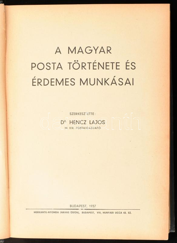 Dr. Hencz Lajos (szerk.): A Magyar Posta története és érdemes munkái. ... https://www.darabanth.com/de/455-Fernauktion/455.0/Bucher/Bucher-Andere-kuriositaten~2000032/Dr-Hencz-Lajos-szerk-A-Magyar-Posta-tortenete-es-erdemes-munkai-Bp-1937-Merkantil-Nyomda~II3018115