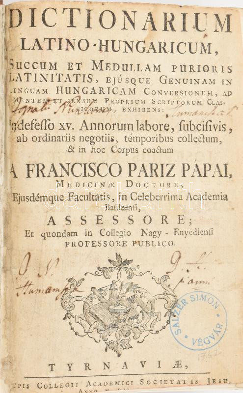 [Pápai Páriz Ferenc-Bod Péter]: Franciscus Páriz Pápai - Petri Bod: Dictionarium Latino-Hungaricum. [Tyrnaviae (Nagyszombat), 1762 (?), Typis Academicis Societatis Jesu(?)], 6+1068 p. Korhű kartonálásban, kissé körbevágott
