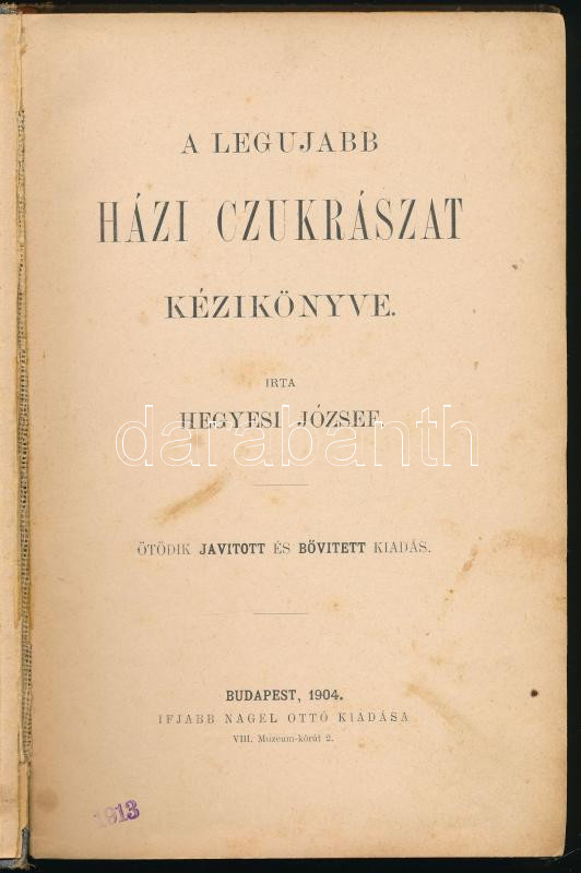Hegyesi József: A legujabb házi czukrászat kézikönyve. Bp., 1904., Ifj... https://www.darabanth.com/de/455-Fernauktion/455.0/Bucher/Bucher-Gastronomie-und-Gartnerei~2000020/Hegyesi-Jozsef-A-legujabb-hazi-czukraszat-kezikonyve-Bp-1904-Ifjabb-Nagel-Otto-207plus8~II3036795