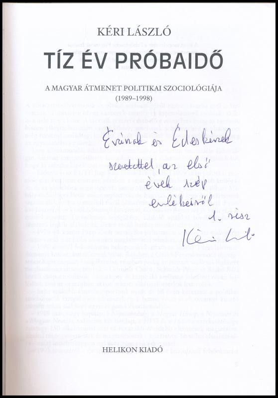 Kéri László.:Tíz év próbaidő. A magyar átmenet politikai szociológiája. Bp., 1998 Helikon Kiadó, Kiadói kartonált papírkötésben, Haraszty István festőművésznek "Édeskének" DEDIKÁLT