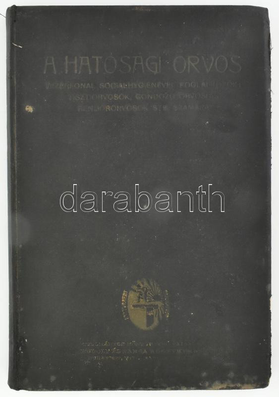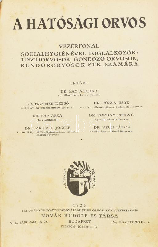 Dr. Fáy Aladár et al.: A hatósági orvos. Vezérfonal socialhygiénével foglalkozók: tisztiorvosok, gondozó orvosok, rendőrorvosok stb. számára. Bp., 1926, Novák Rudolf és Társa ("Pátria"-ny.), 276 p. Kiadói egészvászon-kötés, kissé sérült, foltos borítóval, helyenként foltos lapokkal.