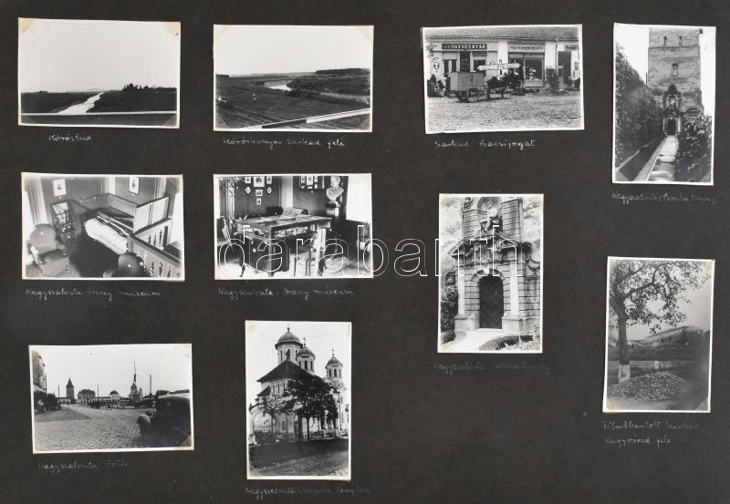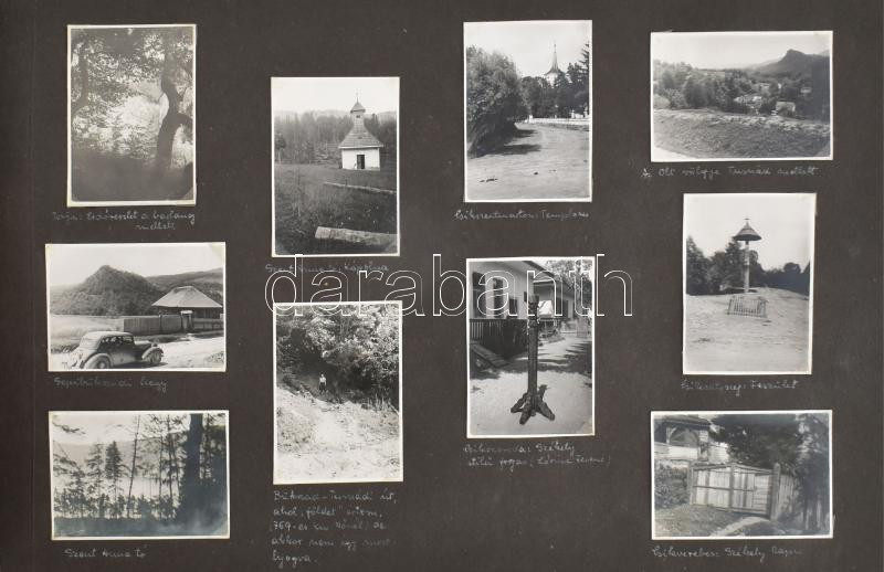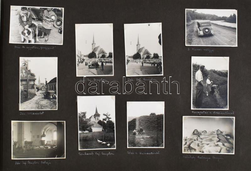 cca 1930-1940 Régi fotóalbum, 176 db feliratozott, beragasztott fotóval, sok erdélyi képpel (Nagyvárad, Kolozsvár, Bánffyhunyad, Dés, Somkerék, Szászrégen, Gyergyószentmiklós, Sepsiszentgyörgy, Kovászna, Kézdivásárhely, stb.), 6×8 cm