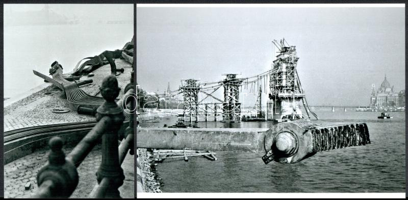 cca 1945 Budapest, torzó képek a Lánchíd maradványairól, Kotnyek Antal (1921-1990) budapesti fotóriporter hagyatékából készült 2 db modern nagyítás, 15x21 cm és 21x15 cm