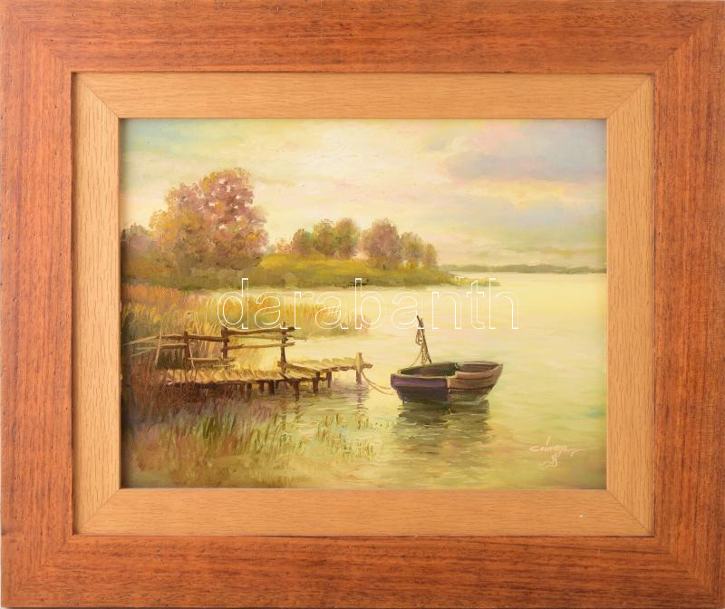 Beschreibung: Czinege Zsolt (1964-): Tópart. Olaj, vászon, jelzett. Dekoratív fakeretben. 31x41 cm