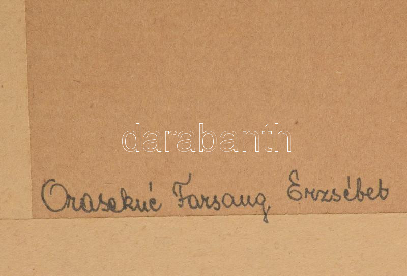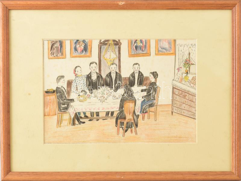 Orisekné Farsang Erzsébet (1929-): Asztalnál. Színes ceruza, papír, jelzés nélkül, hajtásnyommal, hátoldalán névvel feliratozott, üvegezett fakeretben, 15x23 cm