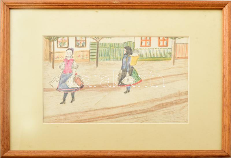 Orisekné Farsang Erzsébet (1929-): Lányok az utcán. Színes ceruza, papír, jelzés nélkül, hajtásnyommal, hátoldalán névvel feliratozott, üvegezett fakeretben, 15x23 cm