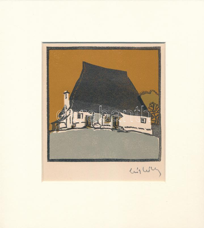 Beschreibung: Kós Károly (1883-1977): Erdélyi ház. Linómetszet, papír, paszpartuban, utólagos jelzéssel, 10×10 cm