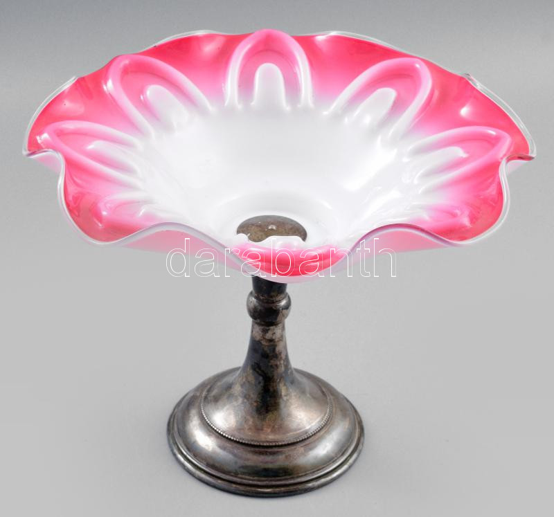 Beschreibung: Antik kétrétegű tejüveg kínáló, ezüst (Ag) talpazattal, jelzett, hibátlan, d: 29,5 cm, m: 23 cm
