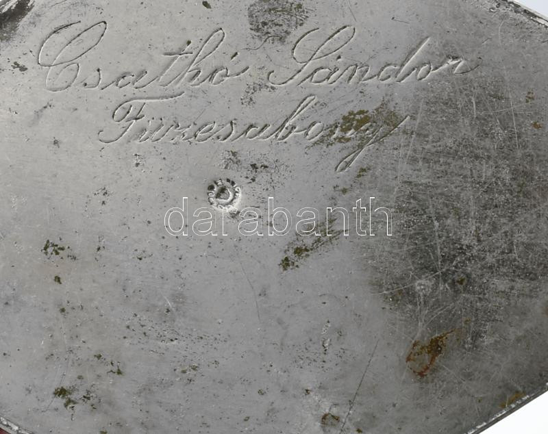 Beschreibung: Art deco kiöntő, alján "Csatkó Sándor Füzesabony" tulajdonosi jelzéssel, javítással, kopással, m: 9 cm