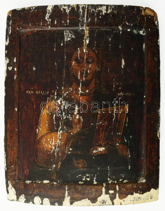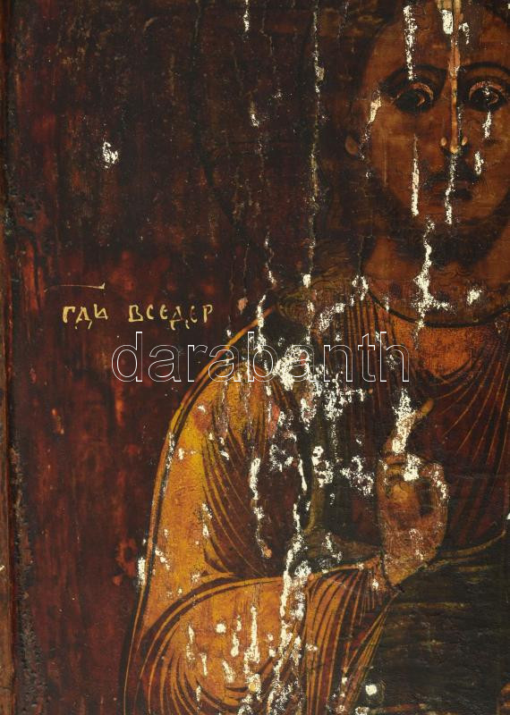 cca 1850, orosz ikonfestő, Vlagyimir, Ikon, Pantokrátor Krisztus. Fa, ... https://www.darabanth.com/de/455-Fernauktion/455.0/Kunst-Dokumente-andere-Sammelgebiete/Antik~500008/cca-1850-orosz-ikonfesto-Vlagyimir-Ikon-Pantokrator-Krisztus-Fa-tojastempera-Serulesekkel-~II3034464