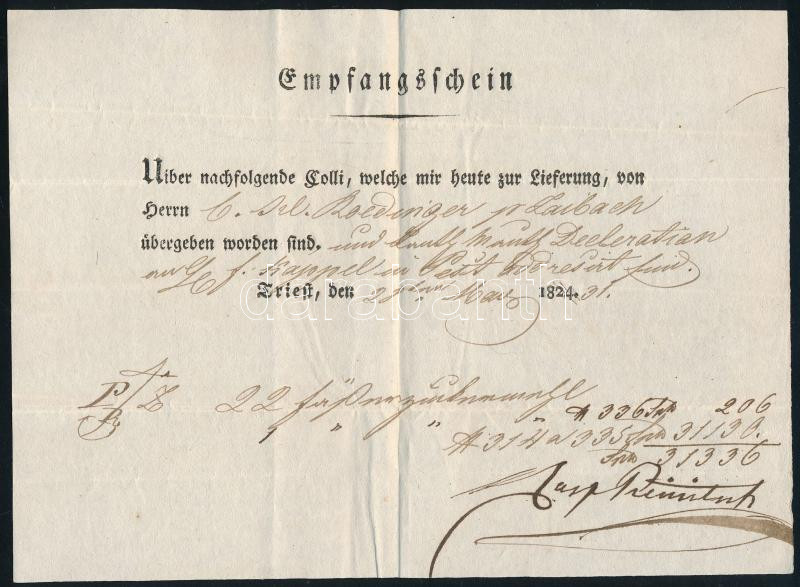 1831 Trieszt, német nyelvű nyugta (Empfangsschein) https://www.darabanth.com/de/455-Fernauktion/455.0/Kunst-Dokumente-andere-Sammelgebiete/Dokument~500020/1831-Trieszt-nemet-nyelvu-nyugta-Empfangsschein~II3017830